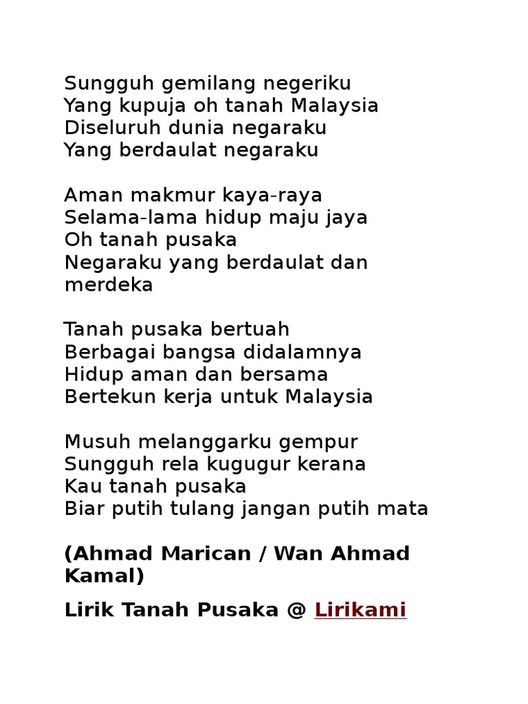 Lirik Lagu Kebesaran Negeri Sarawak Docx Document from cdn.vdocuments.mx Anda mengetahui judul dan nama penyanyi. Satu nama satu gandong satu suku maluku manise gandong e. Negaraku yang berdaulat dan merdeka. Lagu wajib nasional memiliki peran yang penting dalam membangkitkan semangat cinta tanah air. Tanah pusaka lagu mp3 download from lagump3downloads.com. Ini adalah lagu karangan trio ambisi yang saya kombinasi dengan berbagai foto dari tanah maluku utara. Lagu pusaka lagu mp3 download from lagump3downloads.net. Indonesia tanah air beta pusaka abadi nan jaya.