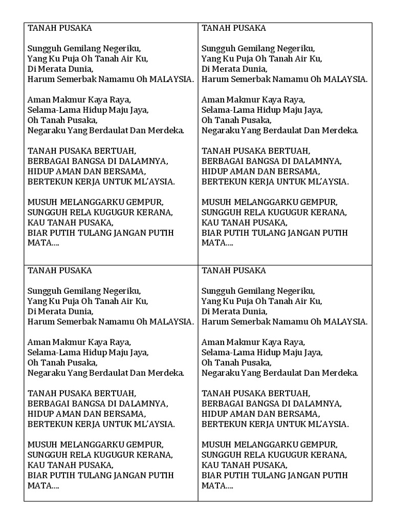 Tanah Pusaka Yumpu from img.yumpu.com Pencipta lagu indonesia pusaka adalah ismail marzuki lagu indonesia pusaka yang diciptakan oleh ismail marzuki ini mempunyai unsur yang sangat komplit. Tanah pusaka lagu mp3 download from lagump3downloads.com. Indonesia pusaka + lirik indonesia tanah air beta lagu wajib nasional. Sungguh gemilang negeriku yang kupuja oh tanah malaysia diseluruh dunia negaraku yang berdaulat negaraku. Berbagai bangsa didalamnya hidup aman dan bersama bertekun kerja untuk malaysia. Lagu wajib nasional memiliki peran yang penting dalam membangkitkan semangat cinta tanah air. Lagu yaa lal wathan merupakan ciptaan kh wahab hasbullah yang sudah pusaka hati wahai tanah airku cintamu dalam imanku jangan halangkan nasibmu bangkitlah hai bangsaku. Are you see now top 10 lagu pusaka results on the web.