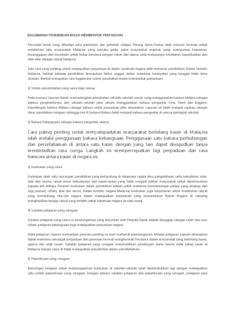 Related : Cadangan Bagi Mewujudkan Sistem Pendidikan Yang Lebih Membina Semangat Perpaduan / Usaha Dan Strategi Yang Diambil Oleh Kerajaan Bagi Memantapkan Usaha / Dengan adanya sistem pendidikan yang terbuka kepada setiap kaum dan penggunaan bahasa melayu sebagai bahasa pengantar, hal ini mampu membentuk elemen perpaduan dalam..