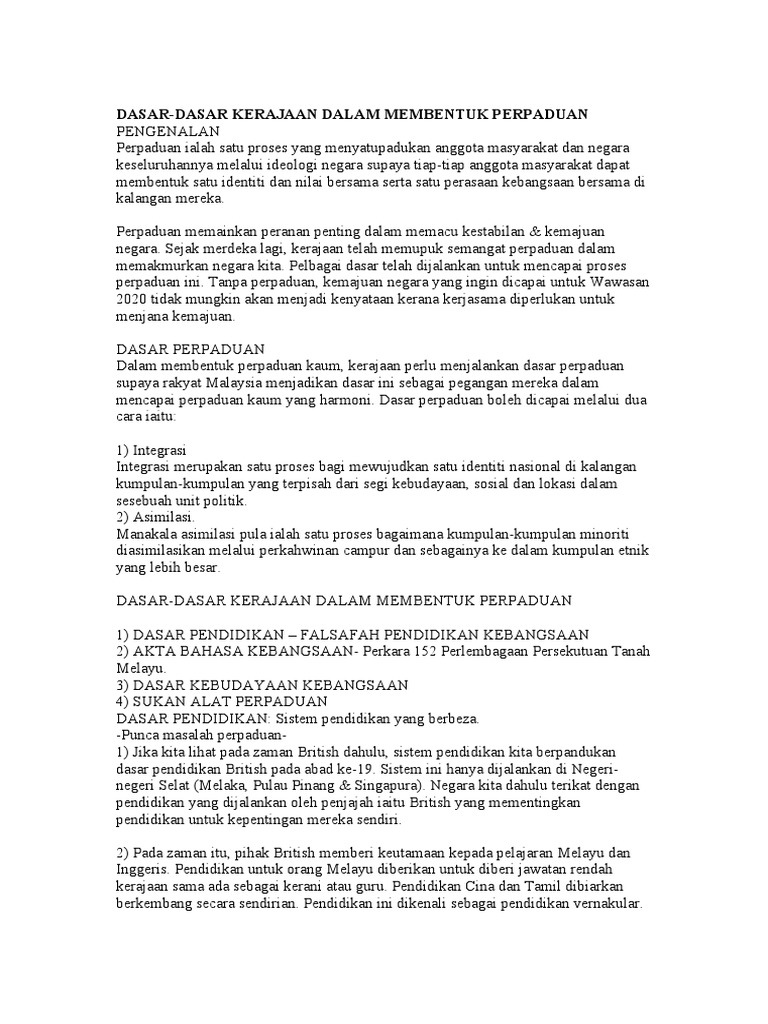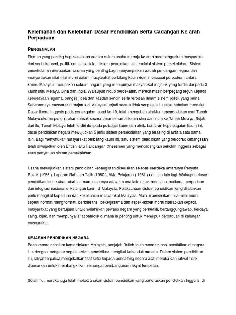 Perpaduan dalam kalangan penduduk tanah melayu yang terdiri daripada pelbagai bangsa dan malah sistem pendidikan berkembang mengikut identiti dan kesetiaan negara asal mereka. Sebagai contoh tujuan lembaga pendidikan adalah memberi pelayanan pendidikan kepada yang membutuhkan. Pelajar harus menyokong cadangan bagi mewujudkan satu sistem pendidikan berteraskan kebangsaan. Yang lebih mendasar yaitu yang tertulis dalam buku keterampilan menjelang 2020 untuk era e. Pendidikan merupakan salah satu aspek pembangunan yang sekaligus merupakan syarat mutlak untuk mewujudkan pembangunaan nasional.